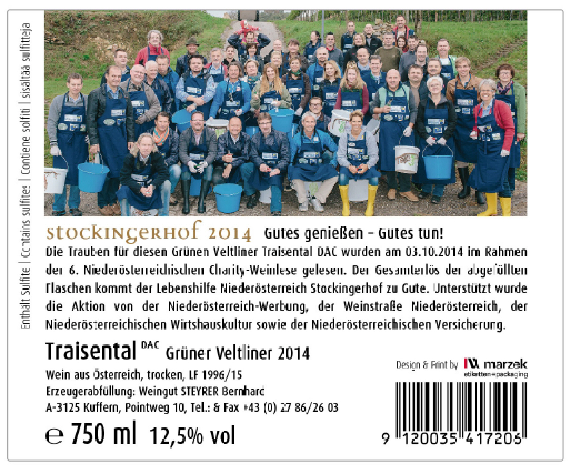 Mit einem Sonderetikett vom Stockingerhof Wölbling gestaltet, geht der Traisental DAC Grüner Veltliner 2014 „NÖ Charity Wein“ am 25.09.2015 wird der Weine im Zuge der heurigen Charity Weinlese in Hagenbrunn präsentiert und geht dann auch in den Verkauf! (Verkostung schon am Kellerfest 18.-20.09.2015 möglich)
